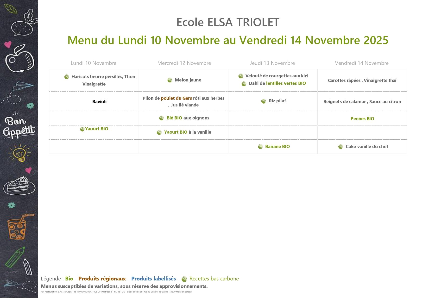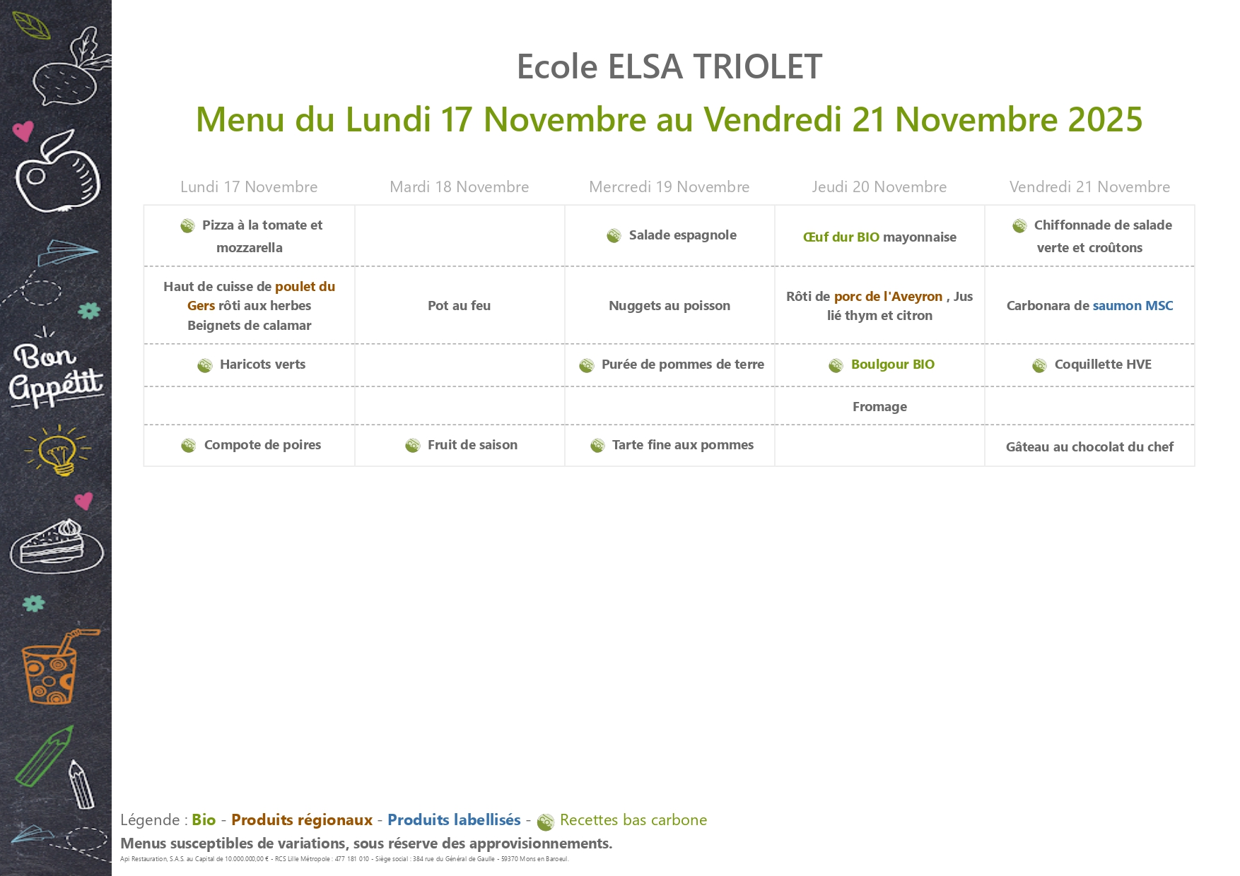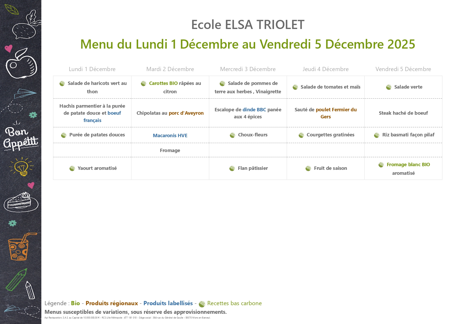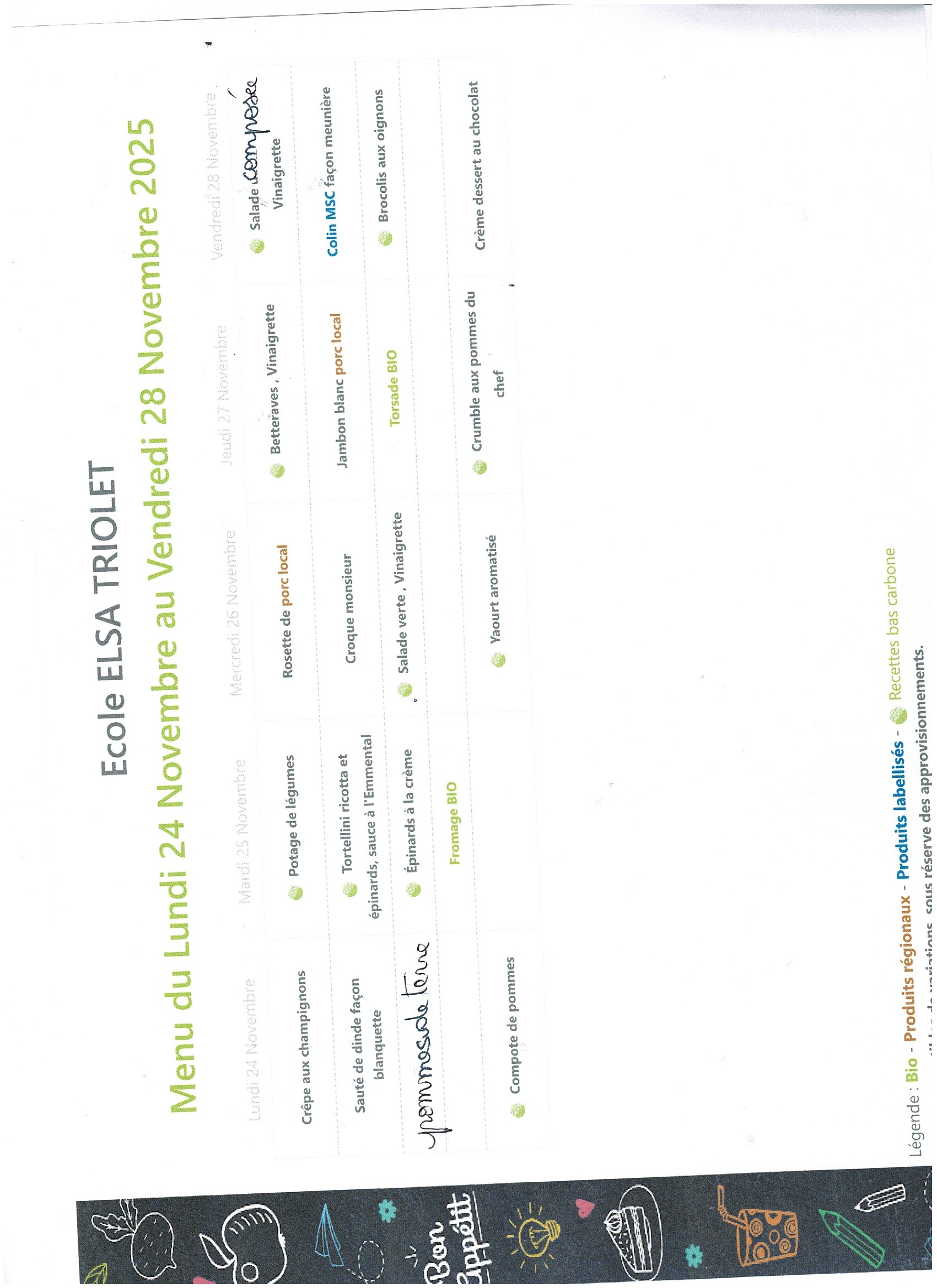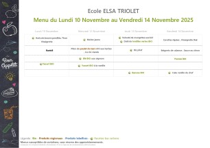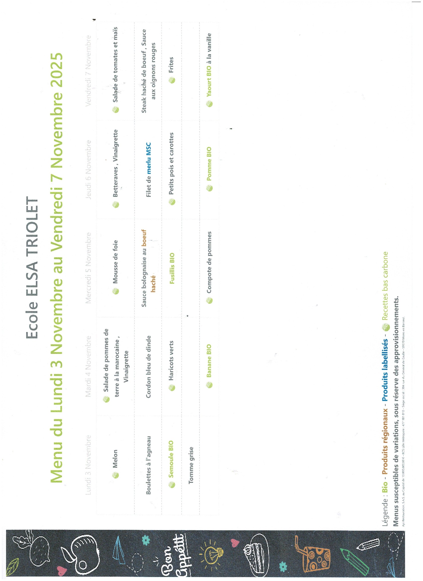 Menus et tarifs de la Cantine